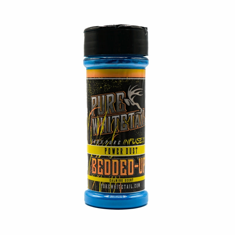 Pure Whitetail’s Bedded-Up Natural Calming Scent Dust is the perfect attractant to help calm whitetail deer and place them at ease. This product comes in powder form and is infused with Pure Whitetail’s natural Bedded-Up calming scent. It provides natural bedding area and deer herd scents and smells to the area and helps mask human odor to calm both bucks and does traveling through or bedding in the area.