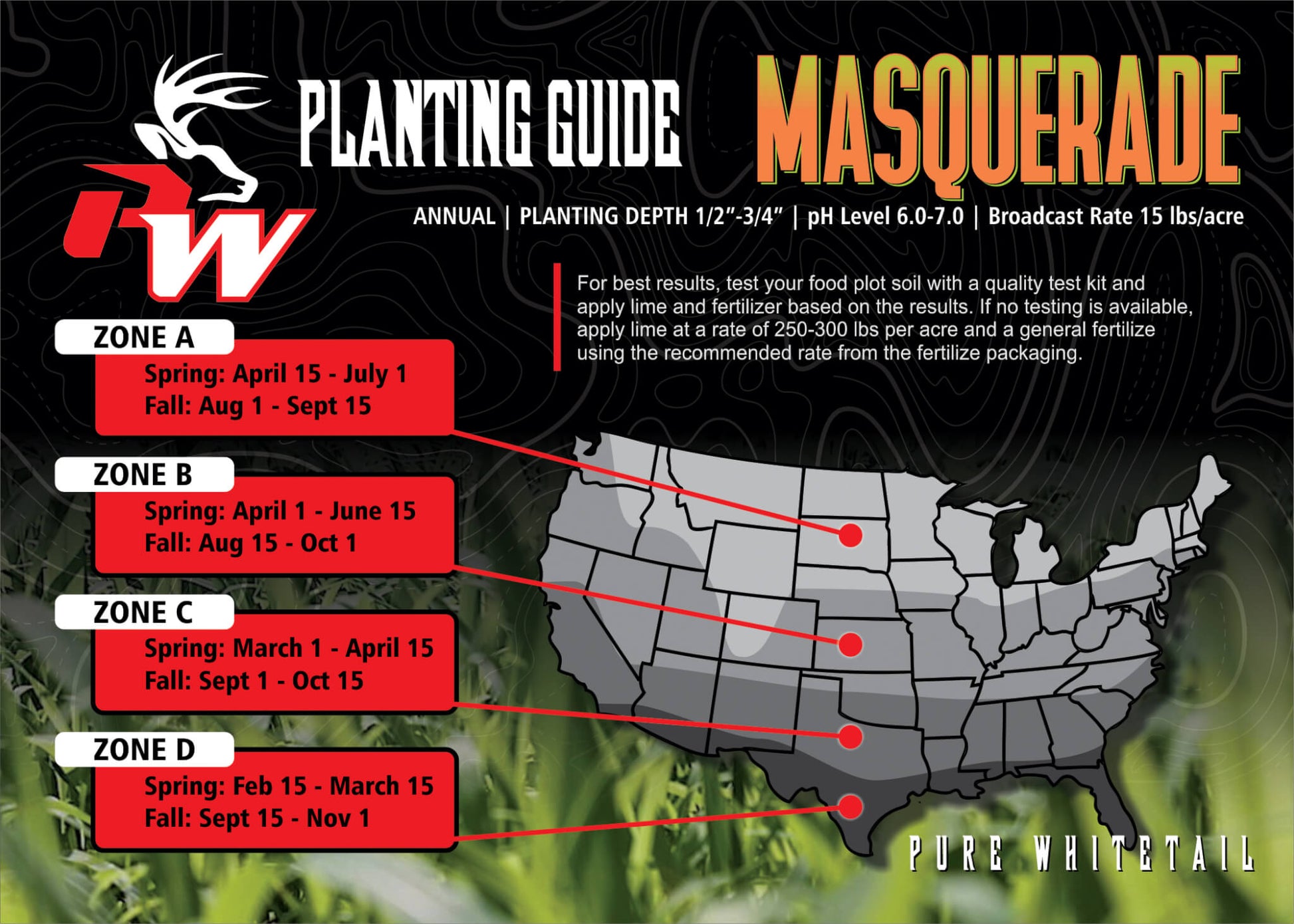 MASQUERADE is a proprietary blend of grains and grasses formulated to produce and extremely tall and thick screen of vegetation. Hunters all over the country are enjoying the benefits of MASQUERADE as a food plot screen to increase daytime deer movement and to mask hunter movement to and from stand locations. Larger MASQUERADE plots provide bedding areas while making deer feel very secure. Plant MASQUERADE to help funnel deer to your prime ambush stand locations.